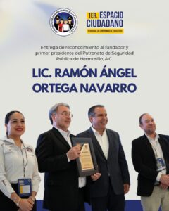 En el marco del 1er. Espacio Ciudadano, se realizó la entrega de un reconocimiento al Lic. Ramón Ángel Ortega Navarro, fundador y primer presidente del Patronato de Seguridad Pública de Hermosillo, A.C., por su visión, liderazgo y compromiso en la construcción de un espacio permanente de diálogo y colaboración entre ciudadanía, sector empresarial y autoridades.