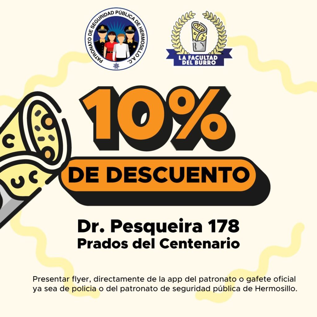 ¡Ven y aprovecha tu descuento en La Facultad del Burro! 🌯✨Policía de Hermosillo, disfruta tu 10% de descuento presentando tu App del Patronato o gafete vigente.